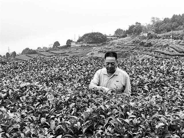 吴全在茶叶基地观察“永川秀芽”的长势。重庆市农科院供图